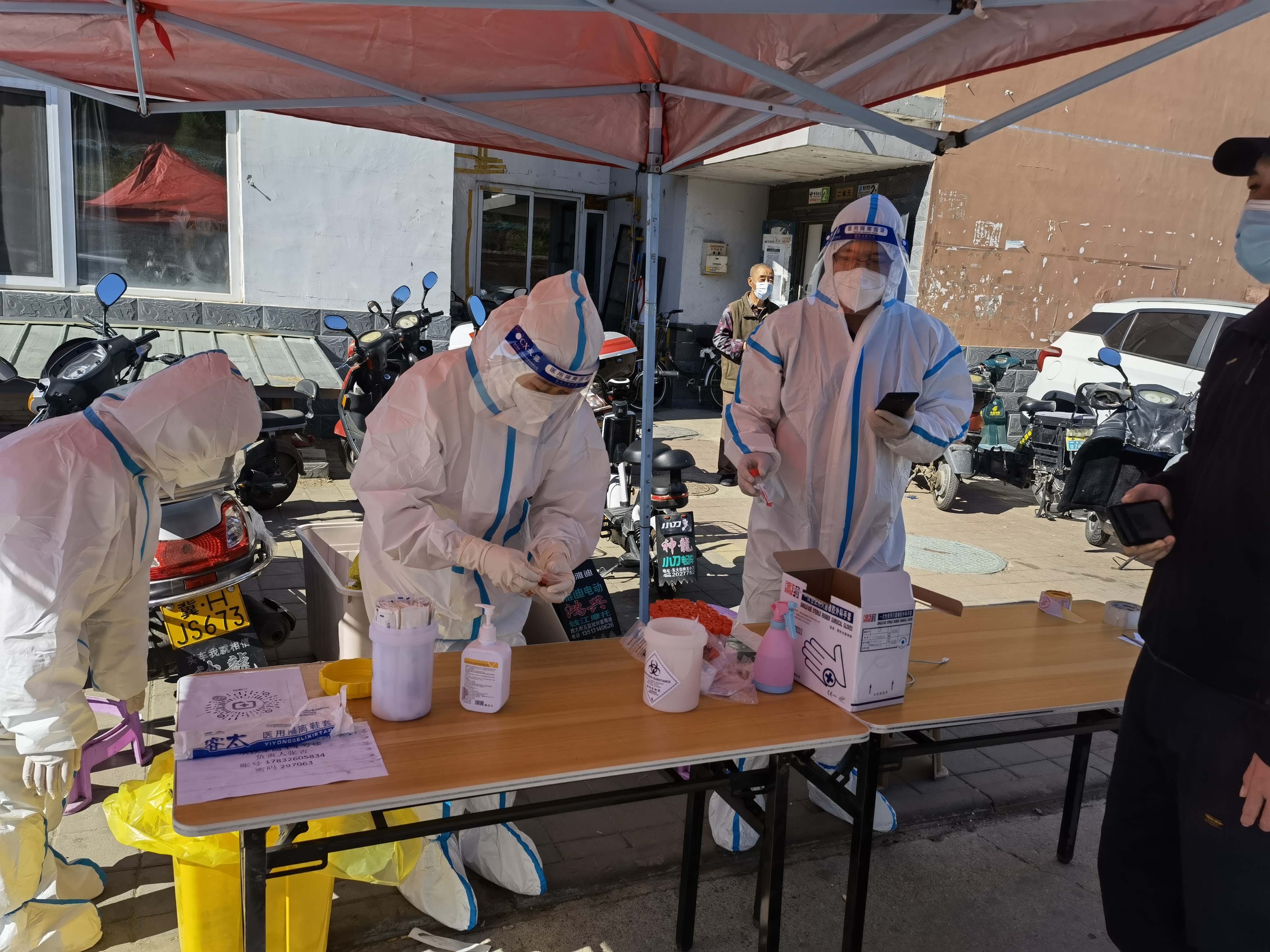 “穿上防護(hù)服成為‘大白’,感到非常光榮,也感到責(zé)任重大?!苯诔械職鉁厣撸瘓F(tuán)公司許平凡、紀(jì)哲負(fù)責(zé)維護(hù)秩序、信息錄入,每天穿著密不透風(fēng)的防護(hù)服、戴著醫(yī)用口罩及手套,里面衣服被汗水浸透,手被捂得發(fā)白,鼻梁被口罩壓出瘀痕,平時(shí)顯得厚實(shí)的腳套,每天都被磨破兩三雙,一刻不停的指揮居民排隊(duì),逐樓的通知居民下樓核酸,嗓子都喊啞了,也從沒有喊過累。