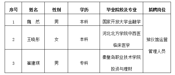 因公司發(fā)展需要,承德市國(guó)瑞置業(yè)有限公司委托第三方機(jī)構(gòu)面向社會(huì)公開(kāi)招聘殯儀館運(yùn)營(yíng)管理人員3名?,F(xiàn)對(duì)擬錄用人員信息進(jìn)行公示,公示期間如有異議,可通過(guò)電話、信函等方式反映,反映意見(jiàn)請(qǐng)署真實(shí)姓名。